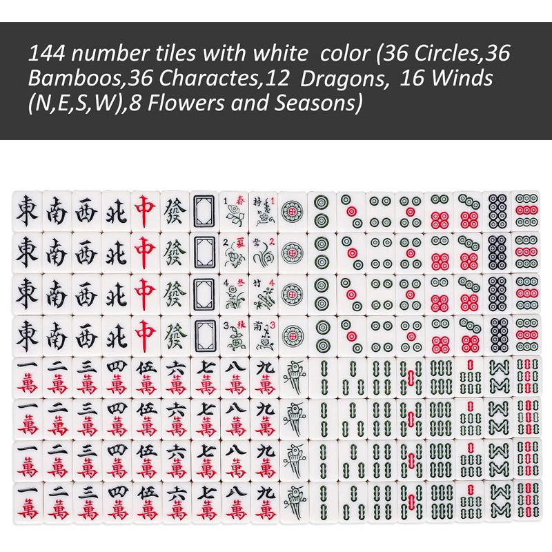 5. Content:144pcs mahjong blocks, 36 Dots, 36 Bams, 36 Cracks, 28 Winds, 8Flowers or as your request.